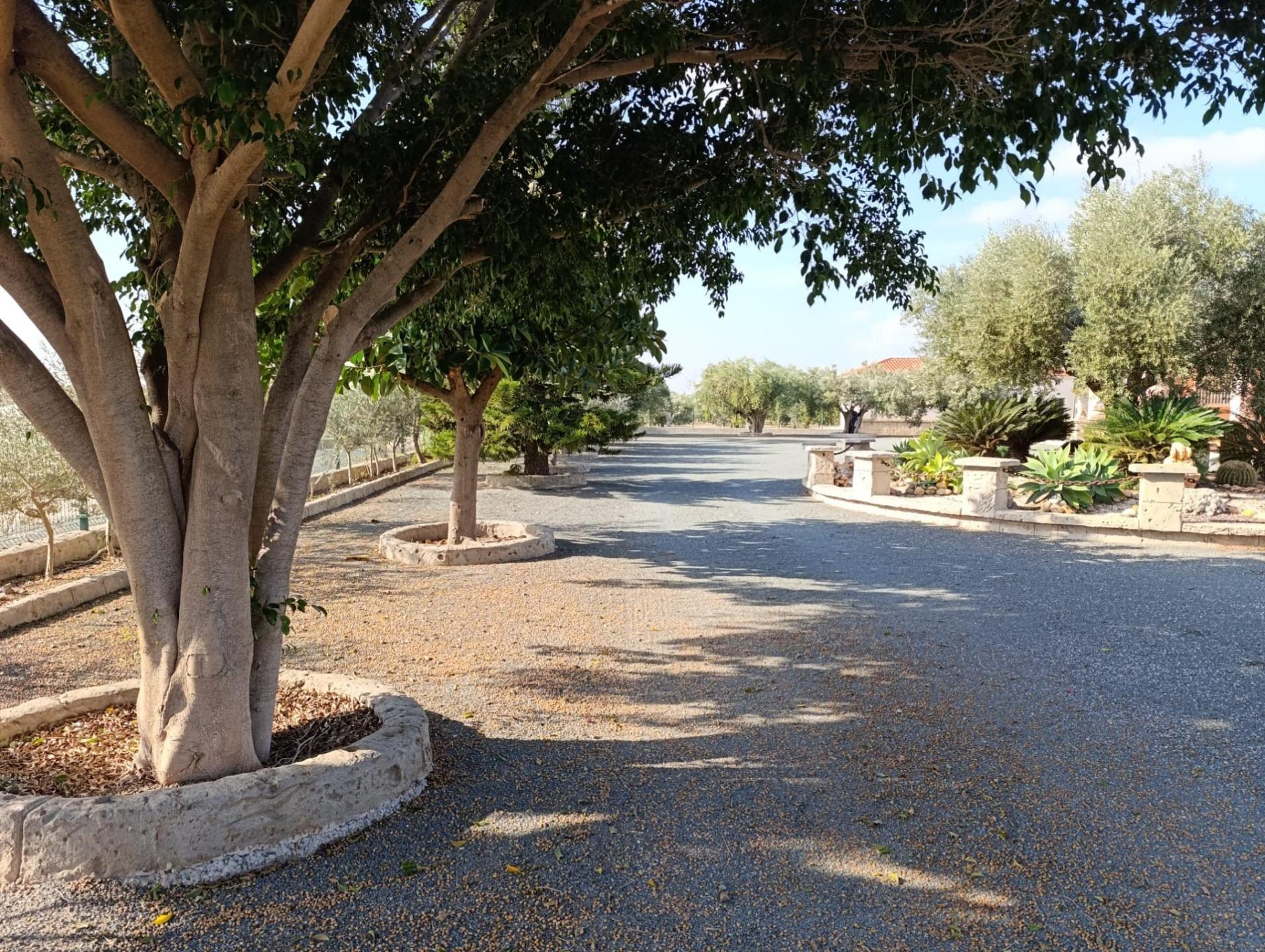 entrance to the property, which is planted with fruit trees such as
